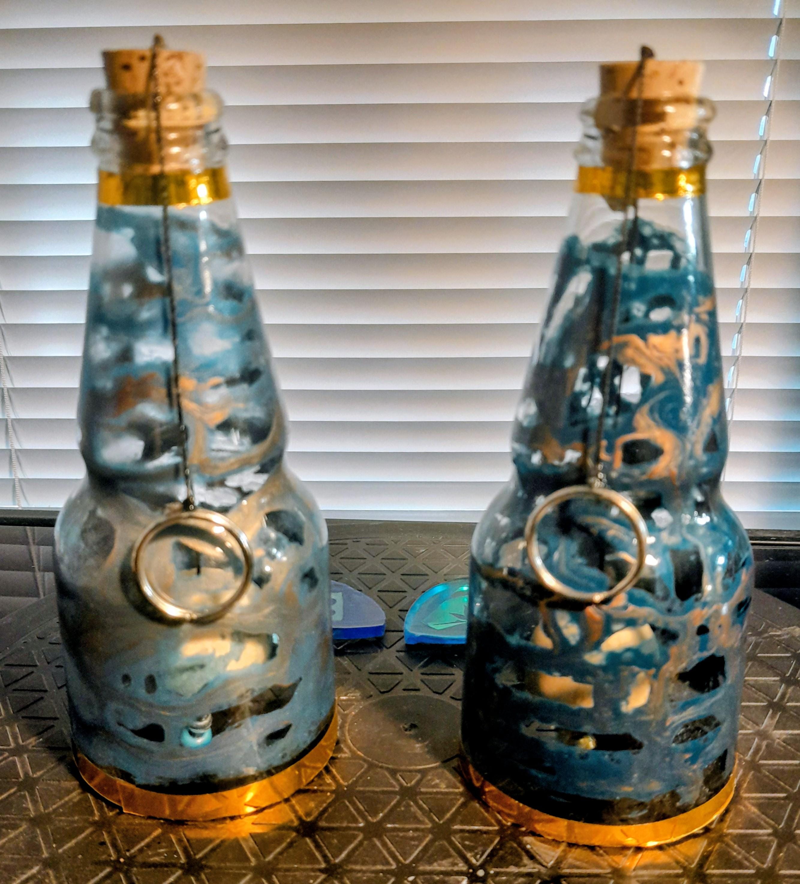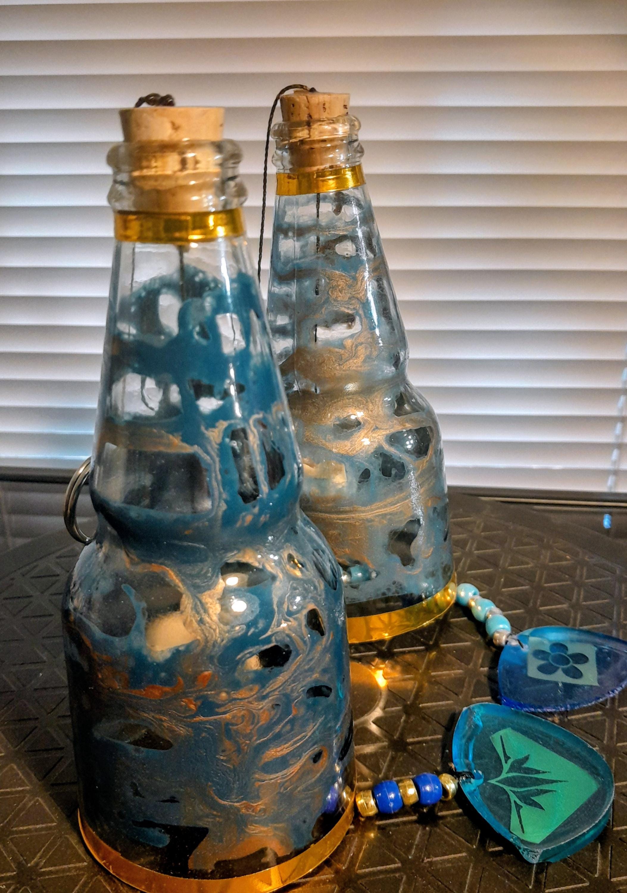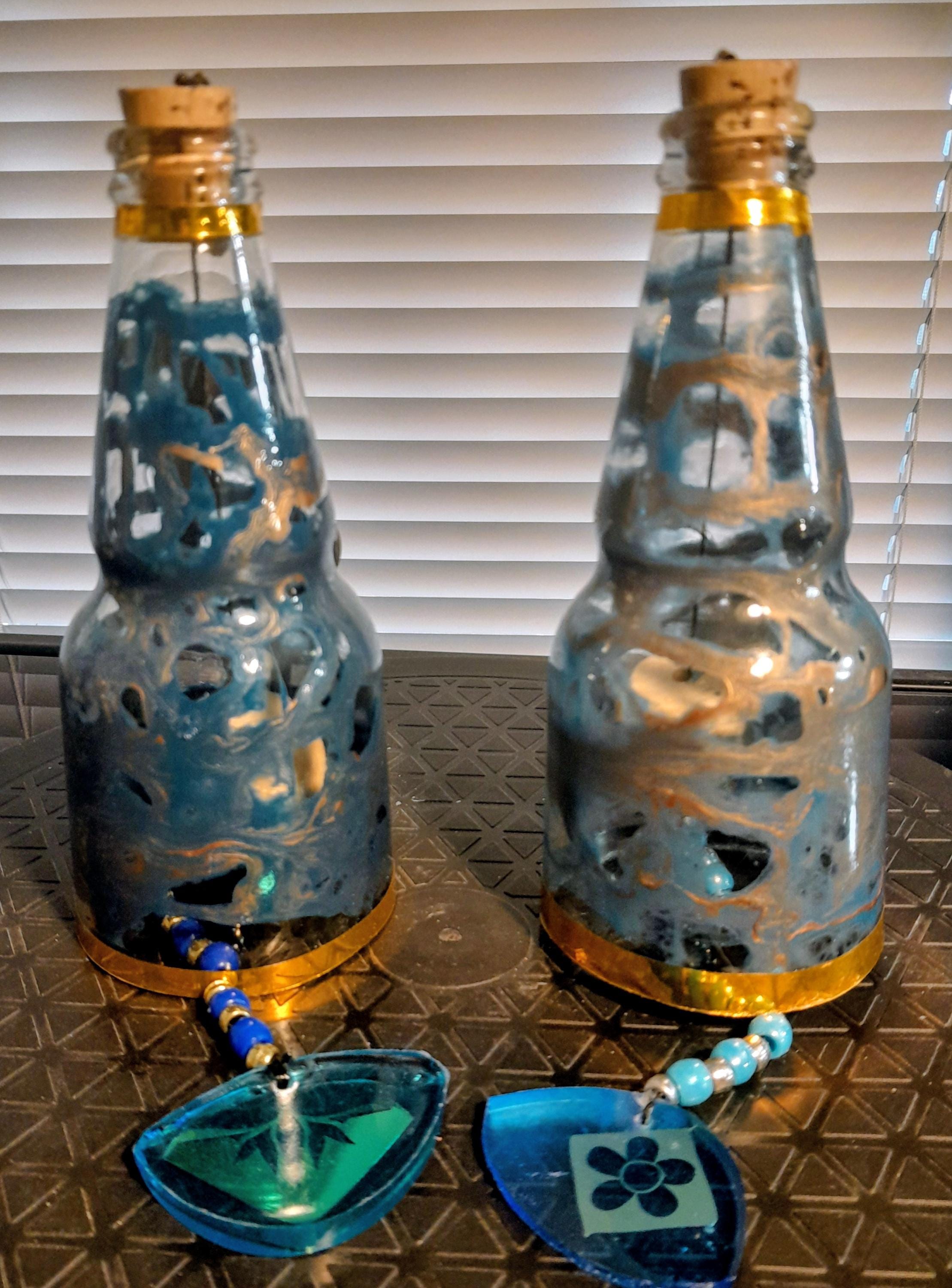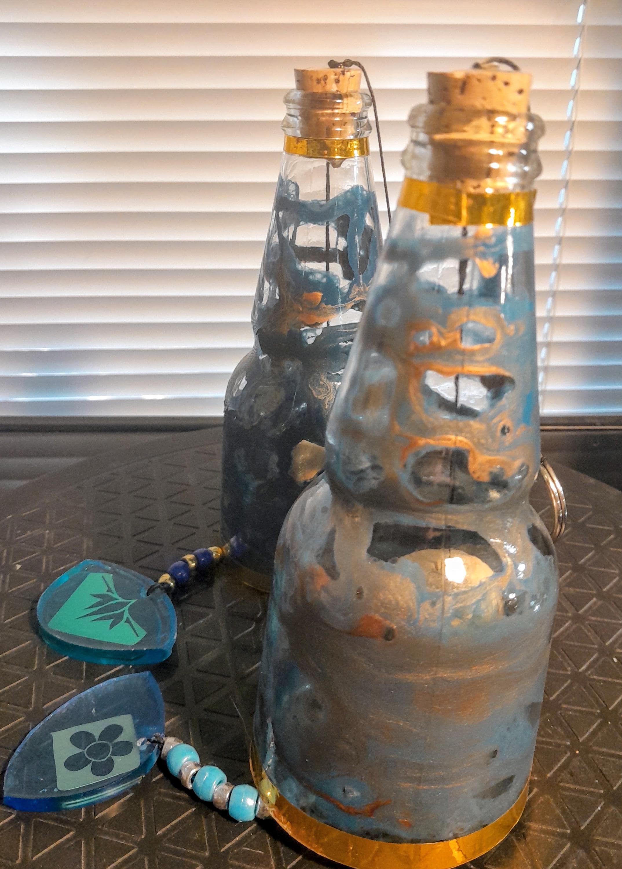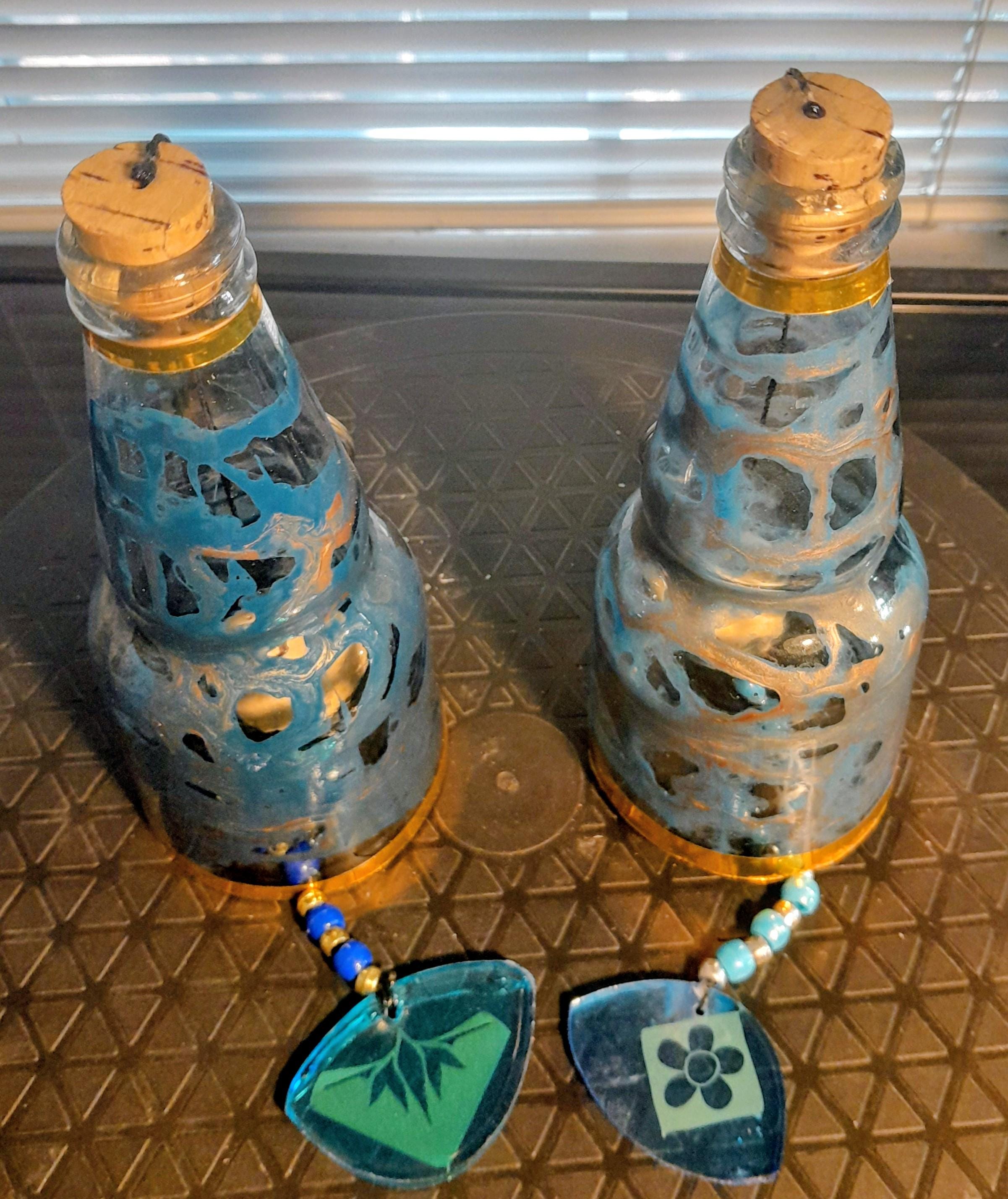 Made from two Beer Bottles hand-cut, and with a One-of-a-kind Artistic Design for an Outdoor Patio