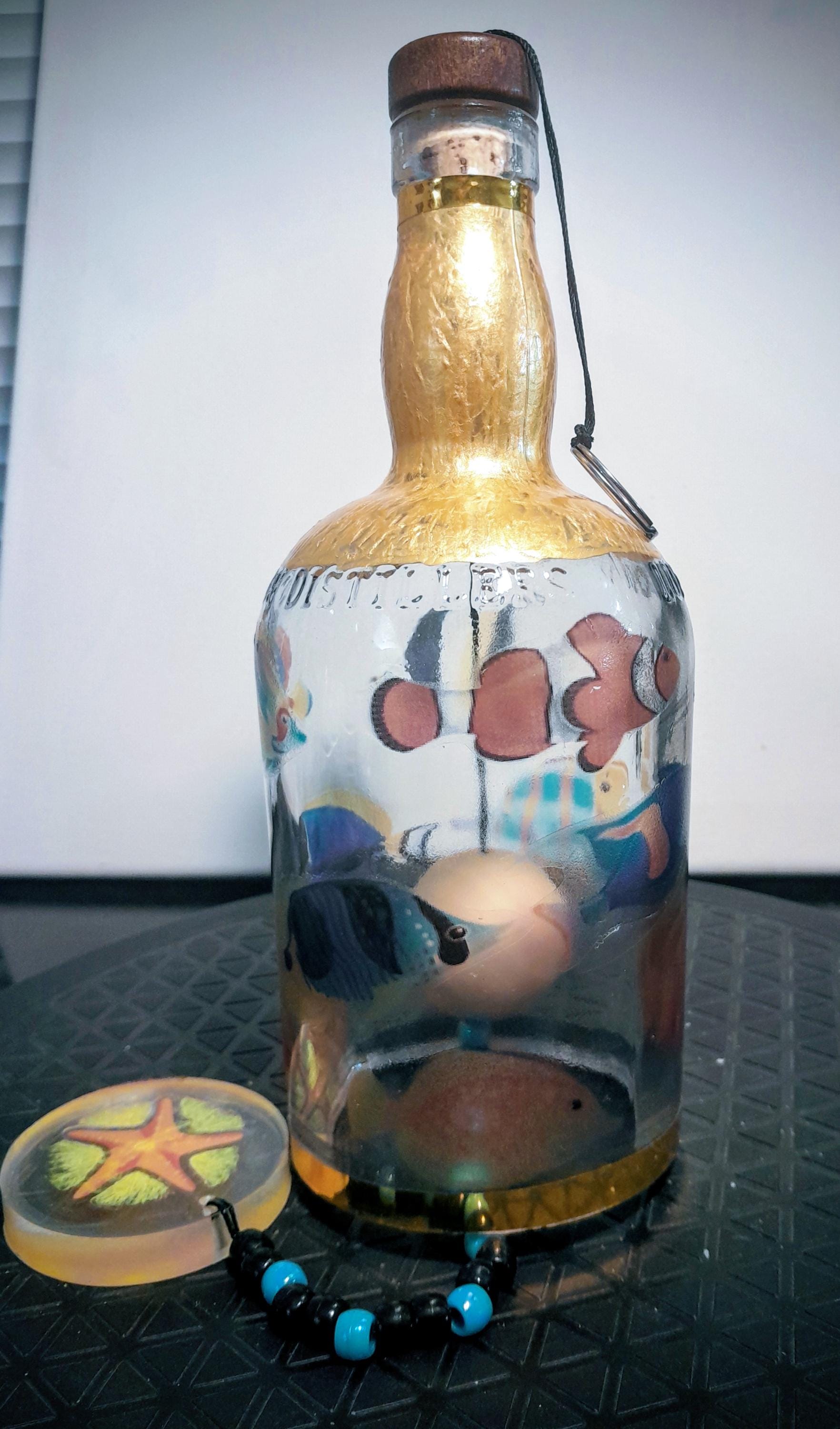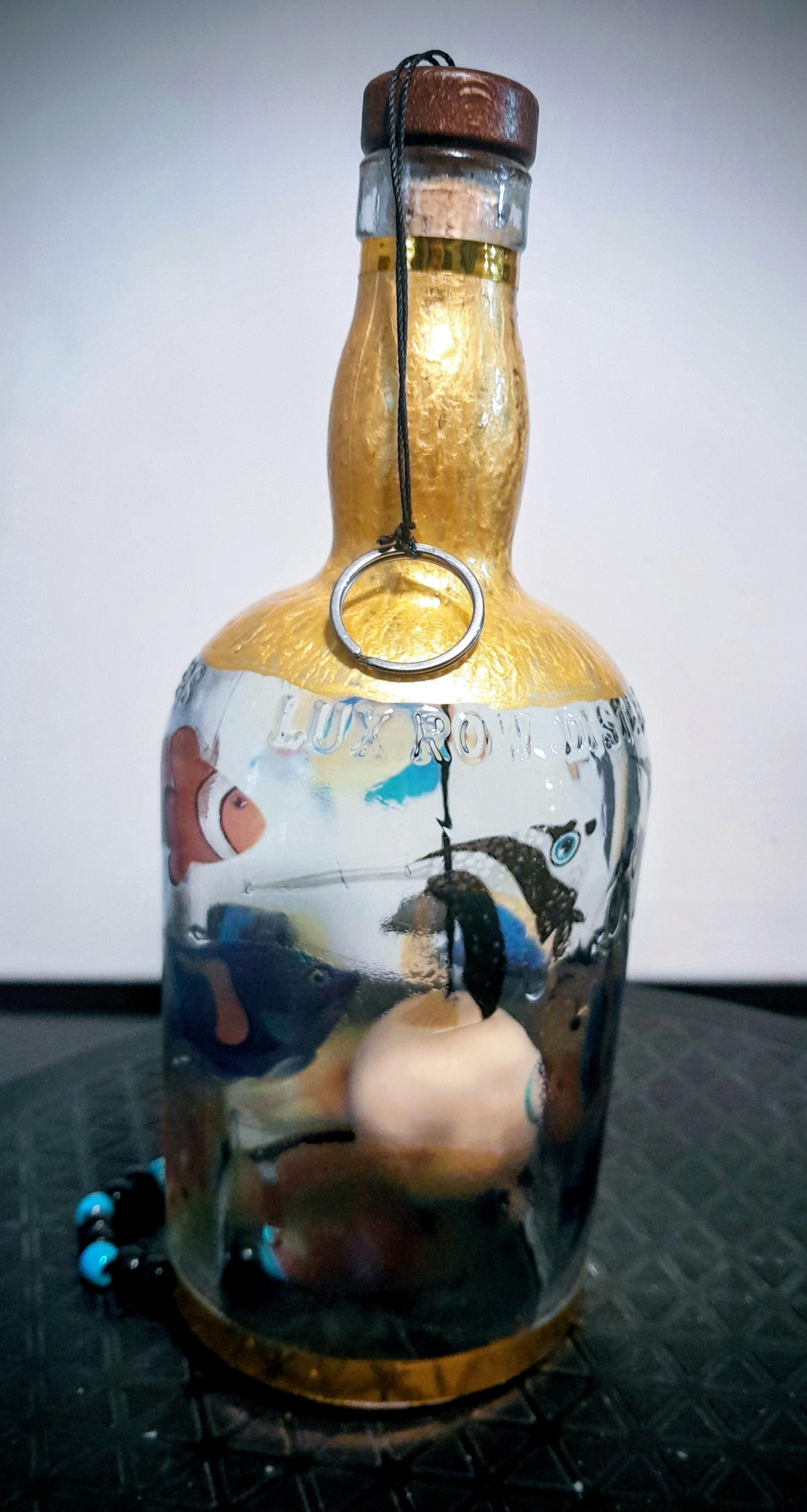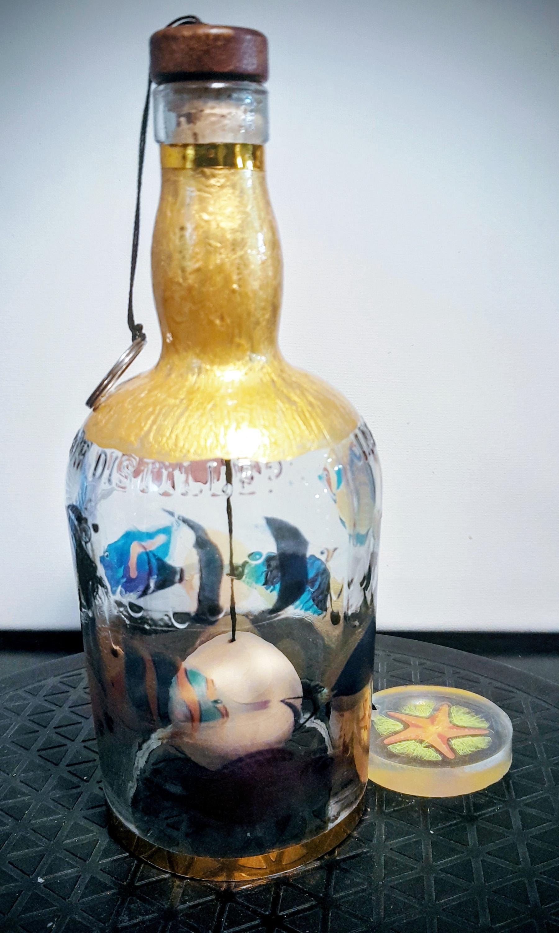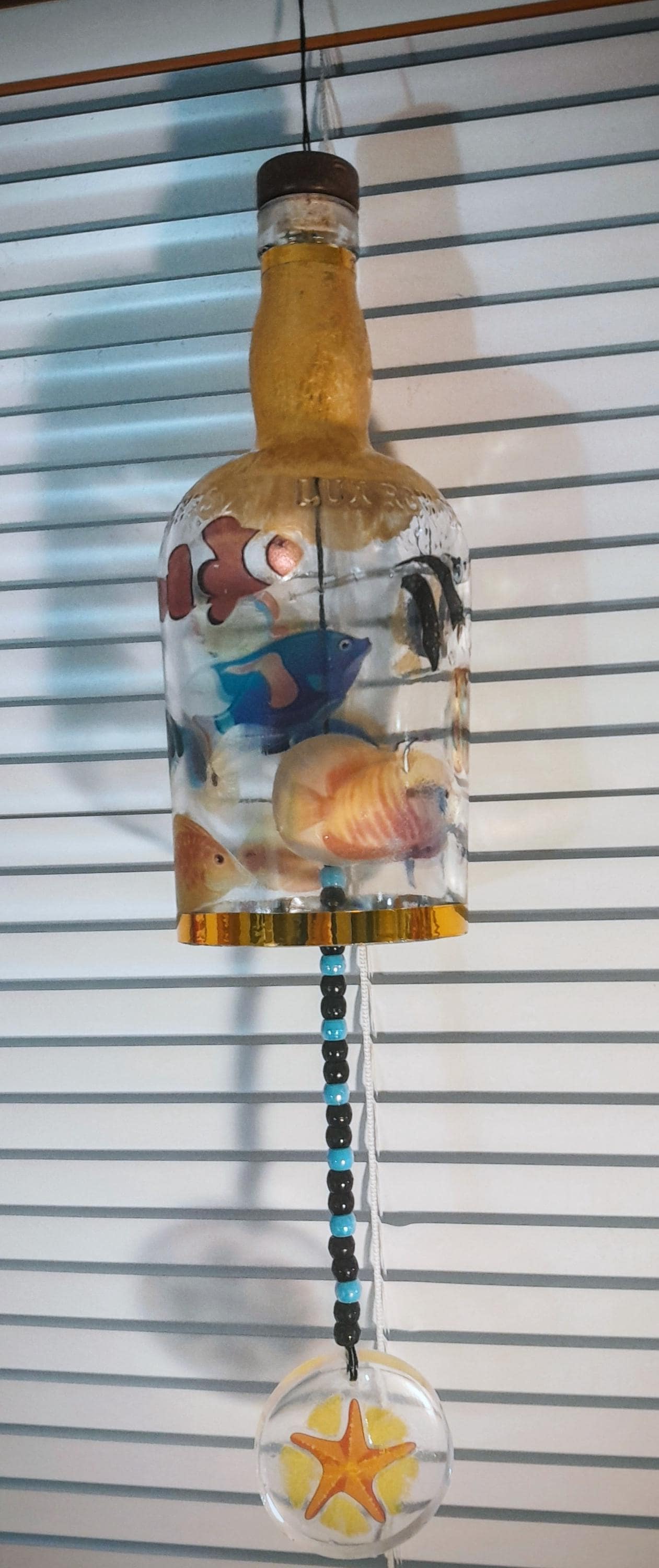 Made from a Liquor bottle, hand-cut, and with a tropical fish design for the outdoor patio
