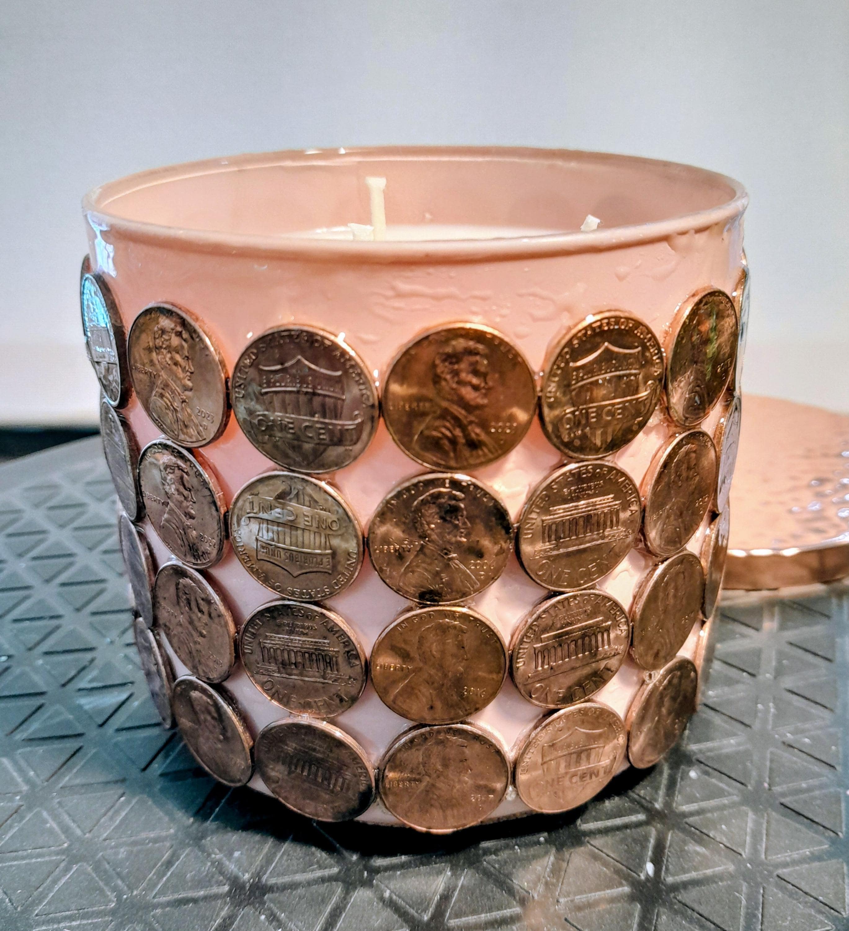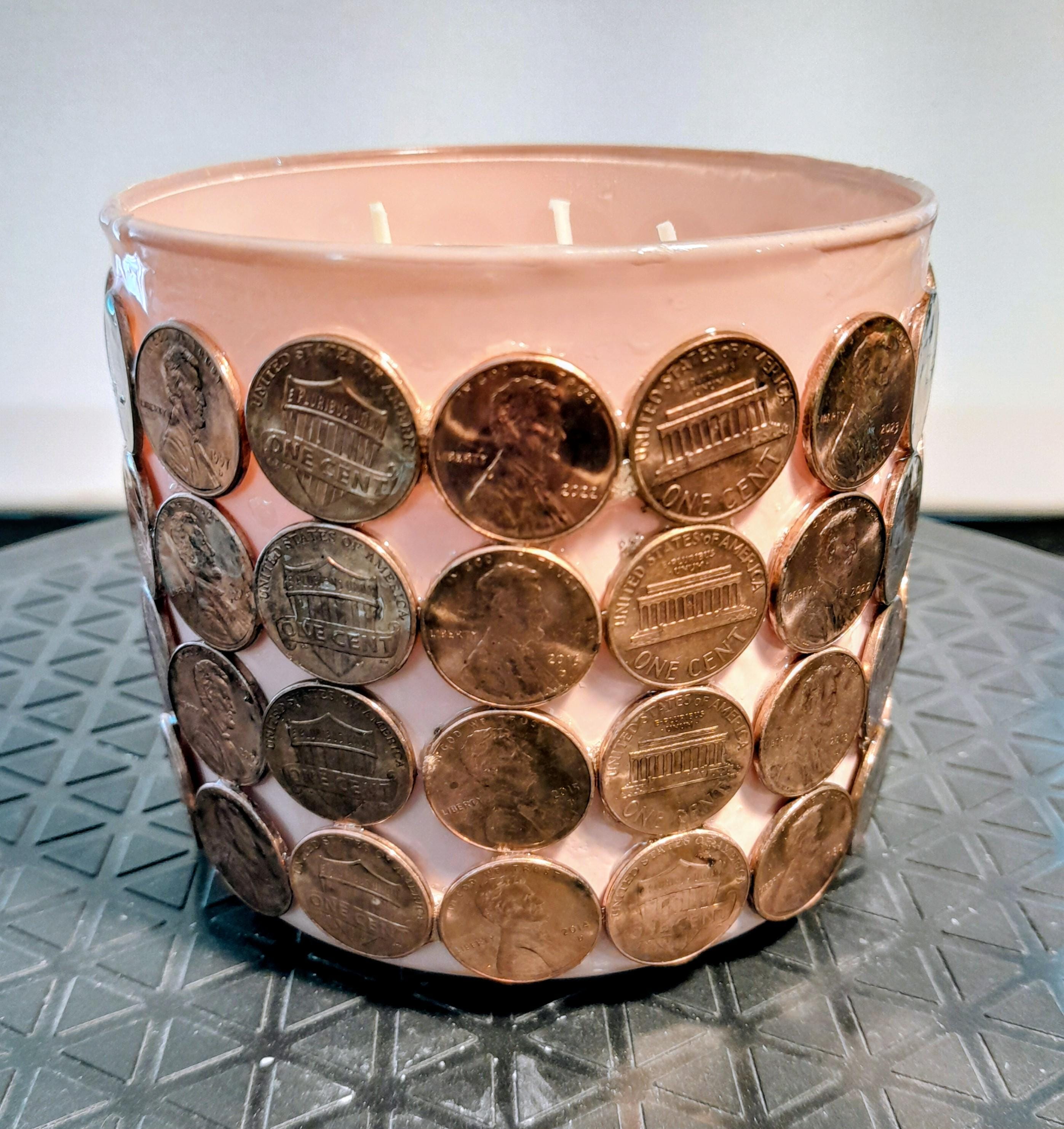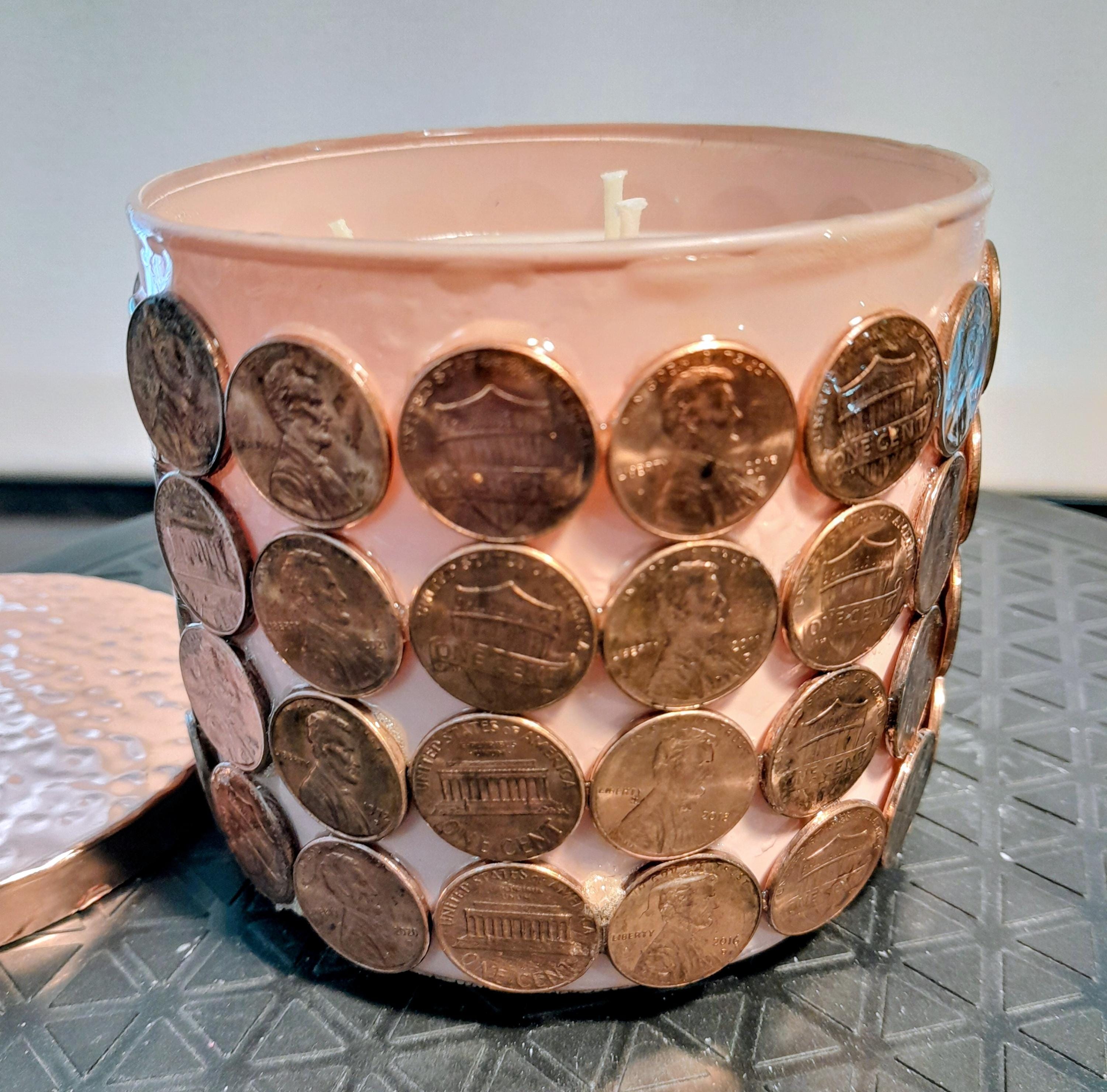 24oz Soy Candle Vanilla Scented. Beautiful, handmade, with pennies.
