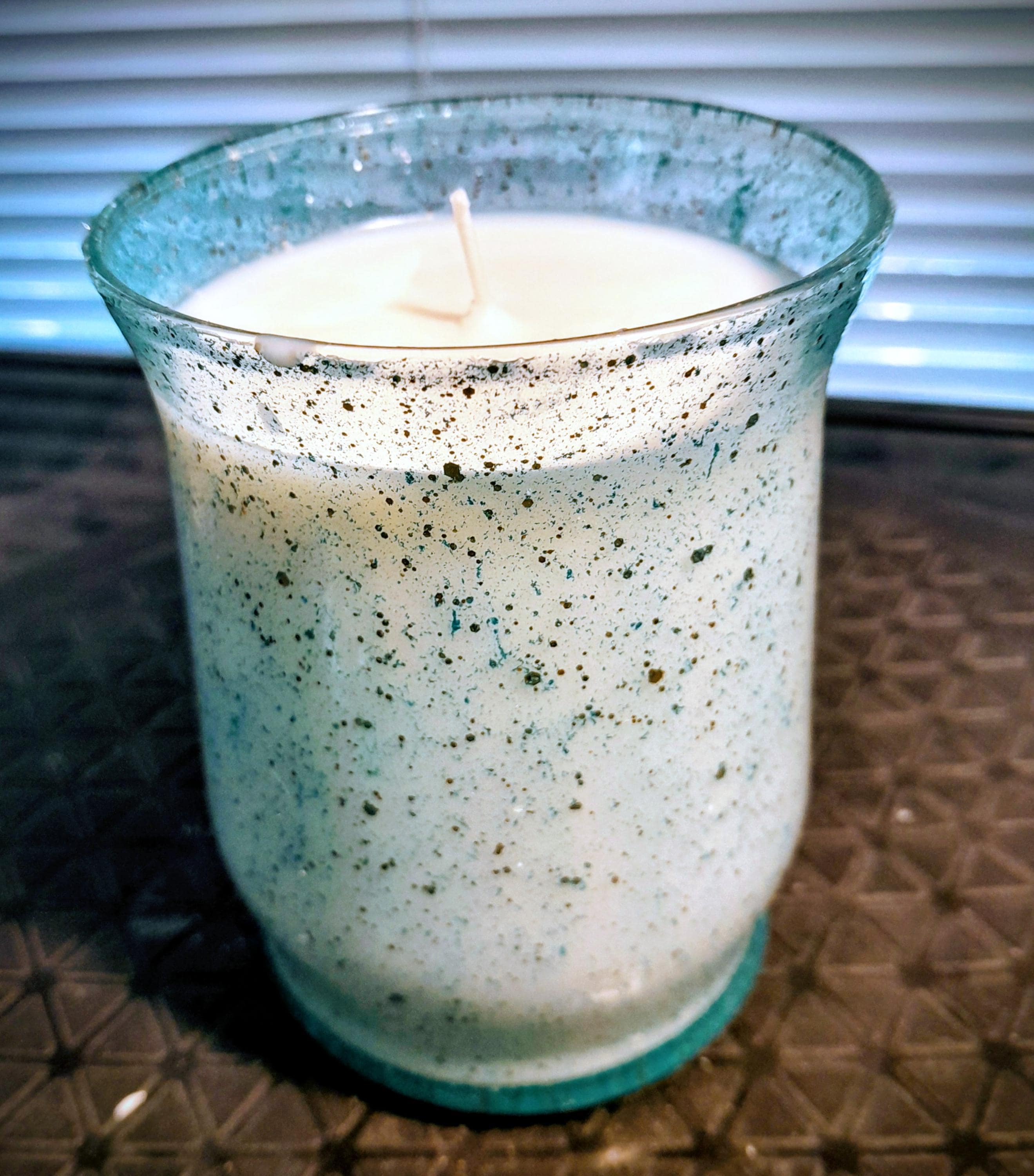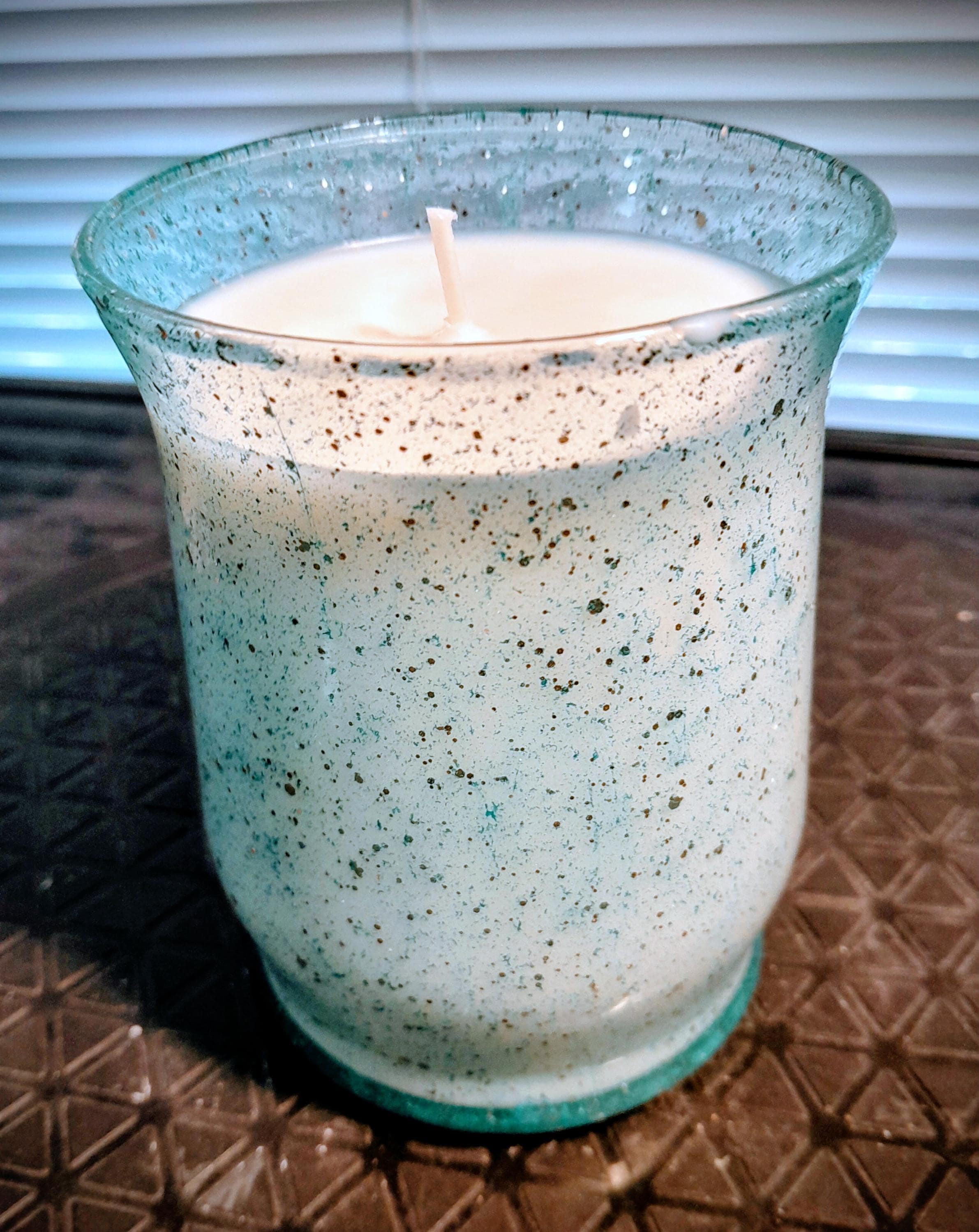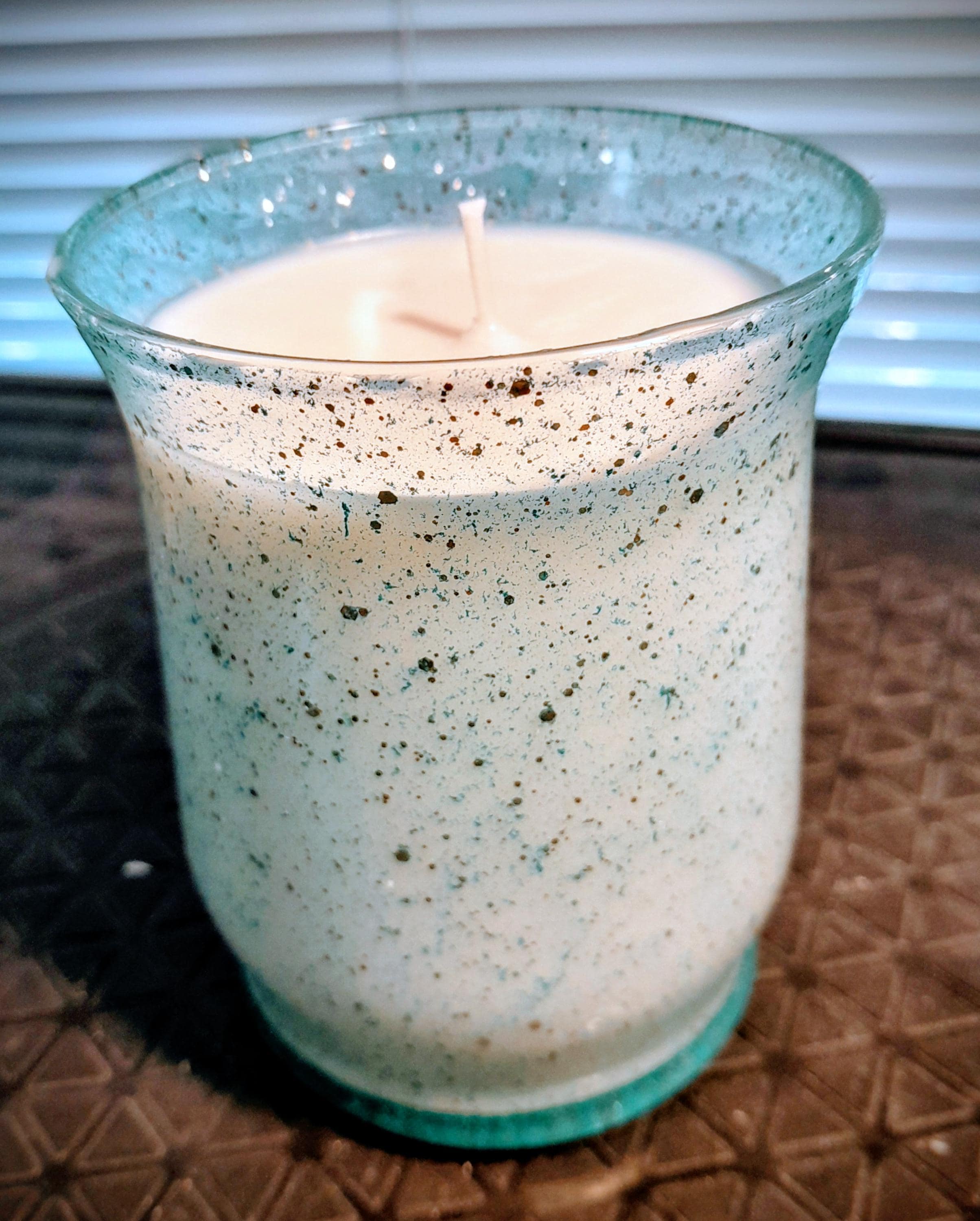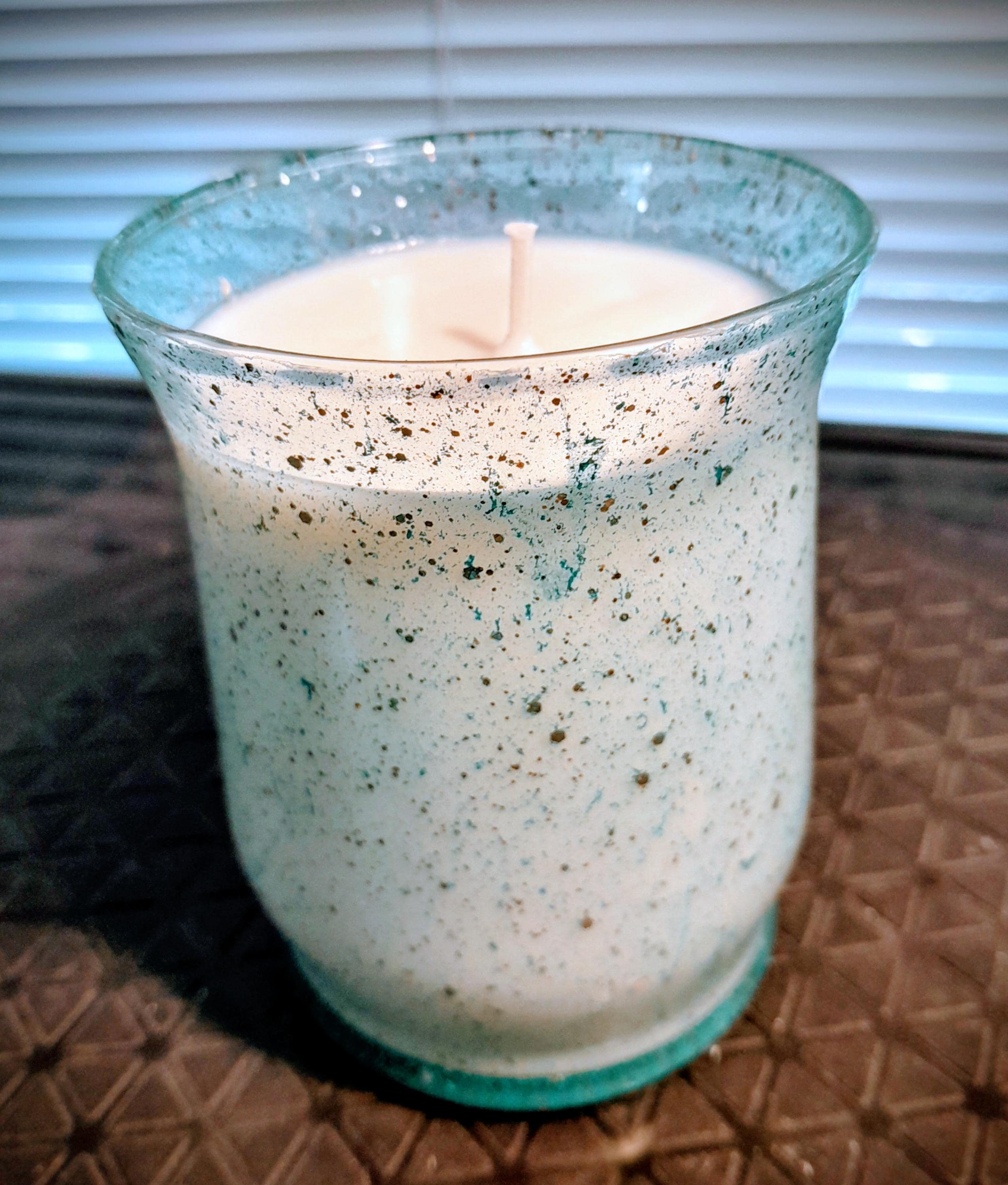 16oz Soy Candle Vanilla Scented. Beautiful handmade, with a colorful acrylic sparkle design