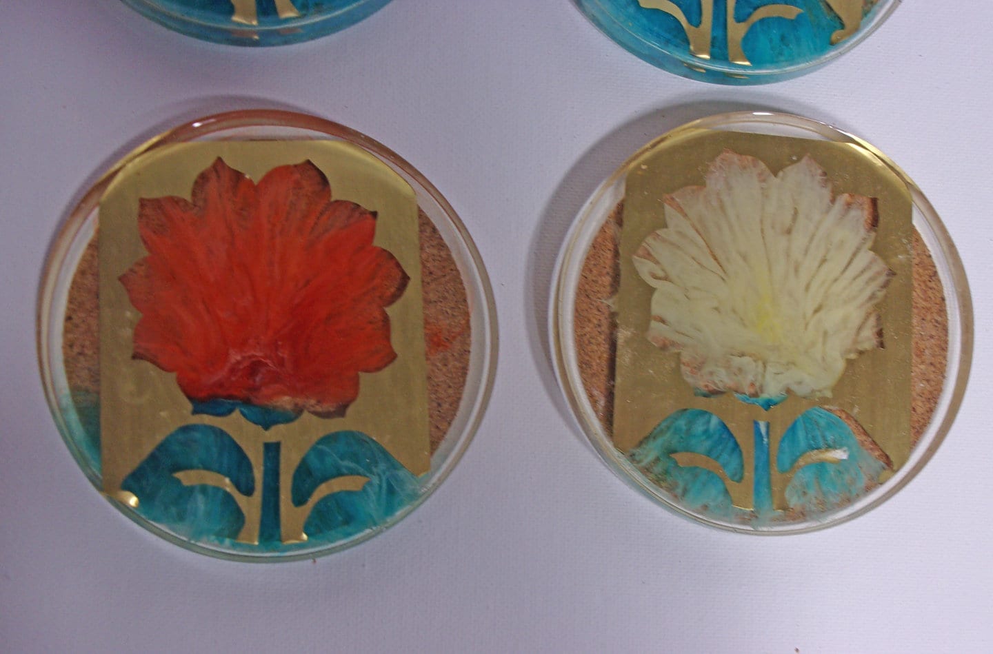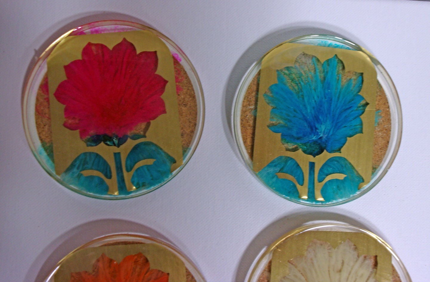Flower acrylic coaster set with a unique dye pattern outlined by a brass stencil.